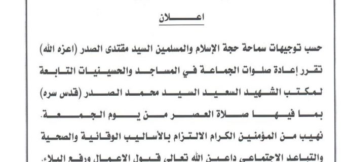 بالوثيقة.. مكتب الشهيد الصدر يعيد صلوات الجماعة بالمساجد والحسينيات ويضع شروطا لذلك