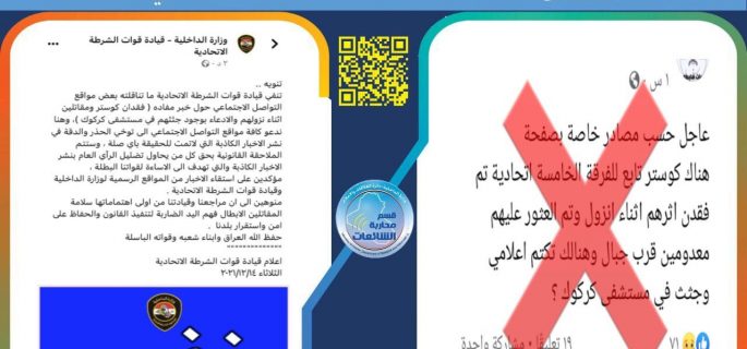 واضافت: “هنا ندعو كافة مواقع التواصل الاجتماعي الى توخي الحذر والدقة في نشر الاخبار الكاذبة التي لاتمت للحقيقة باي صلة ، وستتم الملاحقة القانونية بحق كل من يحاول تضليل الرأي العام بنشر الاخبار الكاذبة والتي تهدف الى الاساءة لقواتنا البطلة ، مؤكدين على استقاء الاخبار من المواقع الرسمية لوزارة الداخلية وقيادة قوات الشرطة الاتحادية”.