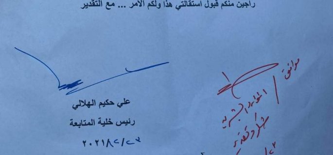 بالوثيقة :استقالة رئيس خلية المتابعة في ذي قار علي حكيم الهلالي