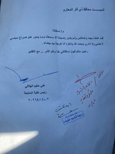 بالوثيقة :استقالة رئيس خلية المتابعة في ذي قار علي حكيم الهلالي