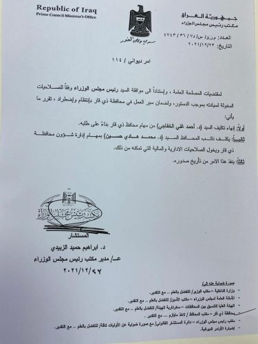 تكليف محمد هادي حسين بمهام ادارة شؤون محافظة ذي قار