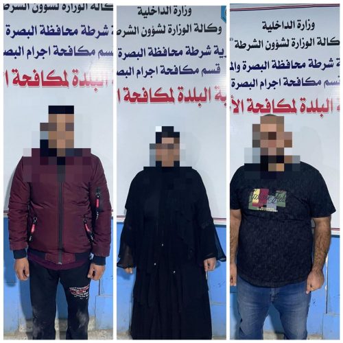 وذكرت القيادة في بيان، انه”بأشراف مباشر من قبل قائد شرطة محافظة البصرة اللواء الحقوقي علي عدنان عبد الحميد و بناءً على معلومات دقيقة وبعملية نوعية واستباقية تمكنت مفارز قسم مكافحة اجرام البصرة من القاء القبض على ثلاثة متهمين بضمنهم امرأة”.