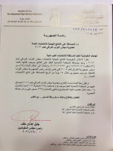 بالوثيقة.. المفوضية تخاطب رئاسة الجمهورية للمصادقة على النتائج النهائية للانتخابات
