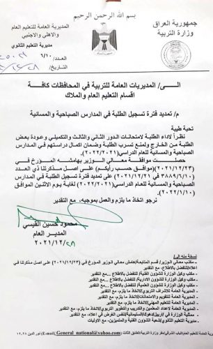 بالوثيقة : التربية تقرر تمديد فترة تسجيل الطلبة في المدارس