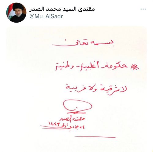 وقال السيد الصدر في تغريدة نشرت على حسابه الرسمي بتويتر ان “حكومة أغلبية وطنية لا شرقية ولا غربية”. انتهى