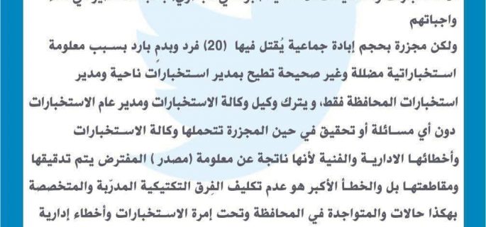 بالتغريدة : فيحان يحمل وكالة الاستخبارات مسؤولية جريمة “جبلة”