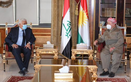 التقى زعيم الحزب الديمقراطي الكردستاني مسعود البارزاني، الأربعاء، رئيس هيئة الحشد الشعبي والقيادي بالاطار التنسيقي فالح الفياض في محافظة اربيل.