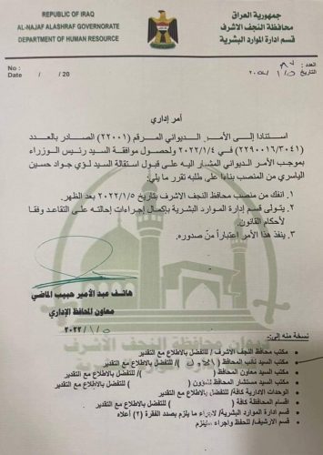 بالوثيقة.. إحالة محافظ النجف السابق لؤي الياسري إلى التقاعد