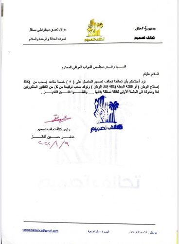 بالوثيقة : تحالف تصميم ينسحب من كتلة (اصلاح وطن)