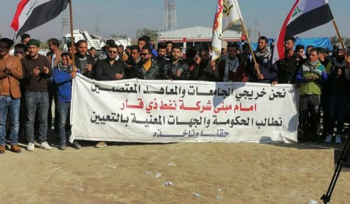 وقال مصدر في المحافظة، ان “العشرات من خريجي الكليات والمعاهد يواصلون اعتصامهم أمام مبنى شركة نفط ذي قار، للشهر الرابع على التوالي، للمطالبة بالتعيين وتوفير فرص عمل لهم”.