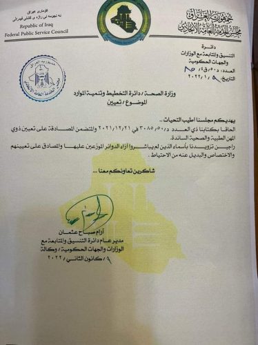 بالوثيقة : الخدمة الاتحادي يخاطب الصحة بشأن الذين تم تعيينهم من ذوي المهن الطبية