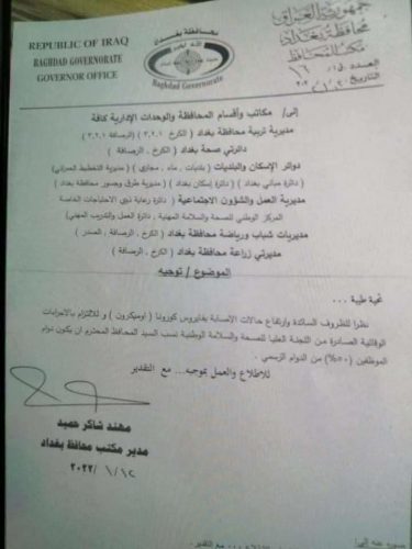 بالوثيقة.. محافظ بغداد يوجه بتقليص الدوام بنسبة 50%