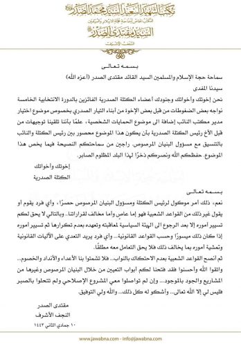 بالوثيقة.. الصدر ينصح جماهير التيار الصدري بعدم الاحتكاك مع النواب