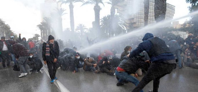 ودخلت قوات الأمن في مواجهات معهم لمنعهم من دخول شارع الحبيب بورقيبة الذي تم إغلاقه بالكامل بالحواجز الحديدية واستعملت قوات الأمن العام المسيل للدموع وخراطيم المياه من أجل تفريقهم.