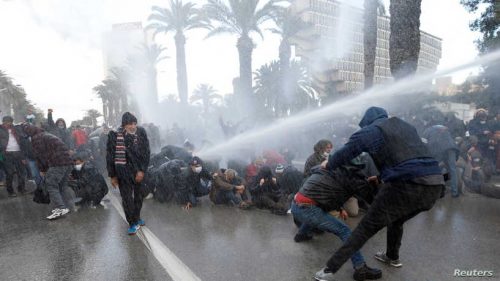 ودخلت قوات الأمن في مواجهات معهم لمنعهم من دخول شارع الحبيب بورقيبة الذي تم إغلاقه بالكامل بالحواجز الحديدية واستعملت قوات الأمن العام المسيل للدموع وخراطيم المياه من أجل تفريقهم.