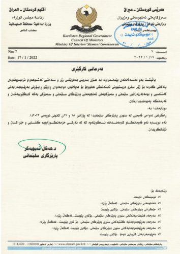 بالوثيقة.. تعطيل الدوام الرسمي في السليمانية لليومين المقبلين