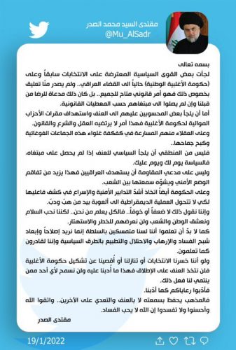 مقتدى الصدر: استهداف مقرات الاحزاب الموالية لحكومة الاغلبية لا يرتضيه الشرع والقانون