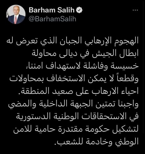 صالح مغرداُ بشأن مجزرة العظيم بديالى: لا يمكن الاستخفاف بمحاولات إعادة إحياء الإرهاب بالمنطقة