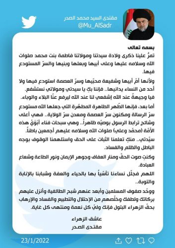 الصدر يغرد بمناسبة ولادة الزهراء.. ابعد عن المسلمين الطائفية والتطبيع والاحتلال