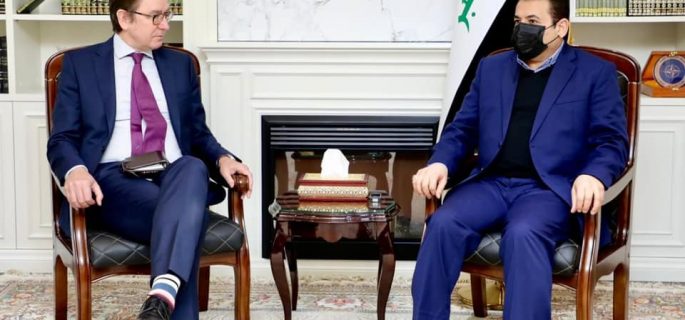 استقبل مستشار الأمن القومي قاسم الأعرجي، كبير مانحي البرامج الخاصة بالسلام ودعم الاستقرار ومدير برامج ابتكارات السلام في المعهد الأوربي للسلام بول سيلز والوفد المرافق له.