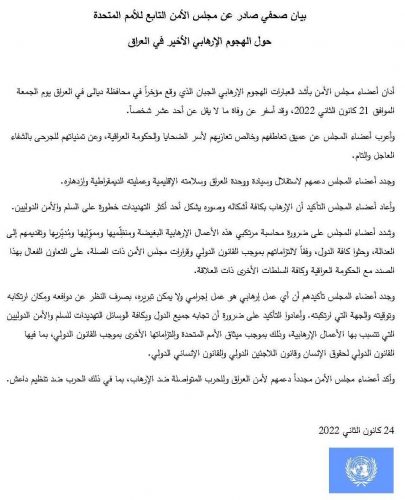 مجلس الأمن الدولي يدين (مجزرة العظيم) ويجدد دعمه لاستقلال وسيادة ووحدة العراق