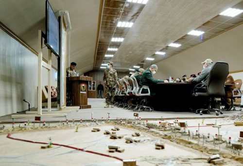 وقال مكتب الكاظمي في بيان تلقت *الرأي* الدولية نسخه منه إن “القائد العام للقوات المسلحة مصطفى الكاظمي يجتمع بالقيادات الامنية والعسكرية في مقر الفرقة السادسة- حرس حدود على الشريط الحدودي العراقي السوري”.