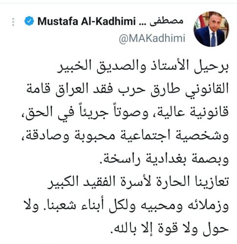 الكاظمي معزياً بوفاة حرب: العراق فقد قامة قانونية عالية وشخصية اجتماعية محبوبة