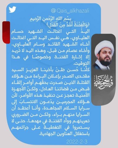بالتغريدة.. الخزعلي يدعو الصدر الى اعلان البراءة من قتلة الشهيد حسام العلياوي
