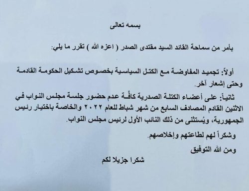 بالوثيقة : الكتلة الصدرية تقرر مقاطعة جلسة الاثنين وتجميد المفاوضات