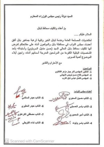 بالوثيقة : نواب بابل يقدمون طلب إعفاء المحافظ الحالي من منصبه