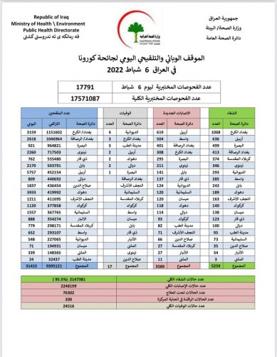 الصحة تسجل 3589 اصابة جديدة بكورونا