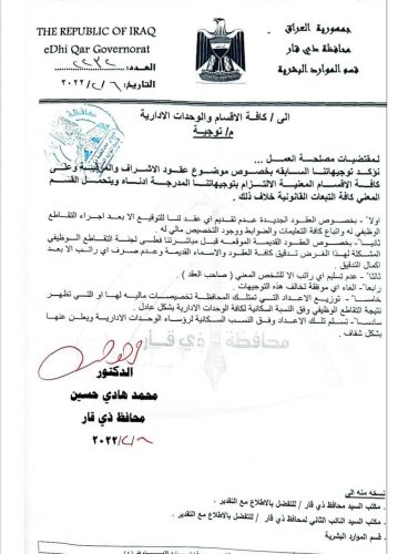 بالوثيقة.. ذي قار تتخذ اجراءات بخصوص المتعاقدين للإشراف على المشاريع الخدمية