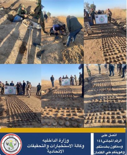 وقالت خلية الاعلام الامني في بيان تلقت*الرأي* الدولية نسخه منه أنه “بعملية استباقية استندت على معلومات استخباراتية دقيقة، تمكنت وكالة الاستخبارات والتحقيقات الاتحادية في وزارة الداخلية من ضبط كدس للعتاد بمنطقة السلمان ضمن قضاء الطارمية شمالي بغداد احتوى على (رمانات هجومية والغام ضد الاشخاص نوعTC50 ) تابعة لعصابات داعش الإرهابية وتستخدم لاستهداف القوات الامنية”.