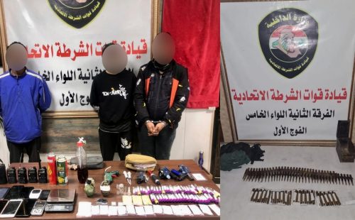 واضافت، انها”ضبطت بحوزتهم 600 حبة مخدرة مختلفة الأنواع و200 غرام من مادة الكريستال المخدرة، 6 بايبات تستخدم للتعاطي، 52 انبولة، ميزان إلكتروني عدد 2 وأجهزة نداء عدد 5 وقنينتي اشعال، بالإضافة الى حيازتهم رمانتين يدويتين، 109 إطلاقة سلاح 12.7،جعبة مخازن بندقية عدد 2″.