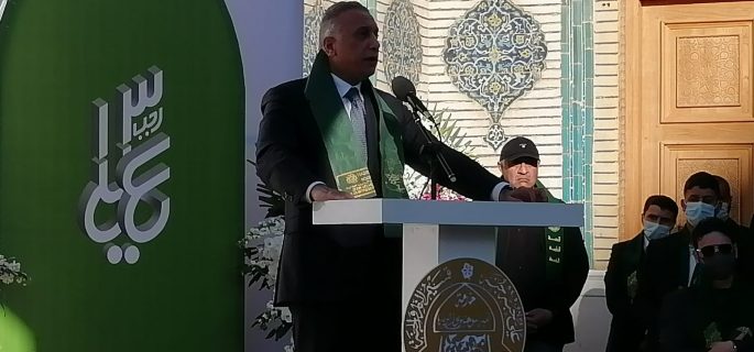 وقال الكاظمي في كلمته في احتفالية رفع الستار عن المنارة الثانية لمرقد الإمام علي بن أبي طالب (عليه السلام)، بمناسبة ذكرى ولادته المباركة، إن العراق يمر بظروف معقدة وهناك من حاول خلق فتنة طائفية”.