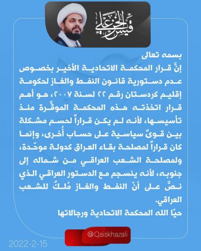 الخزعلي مغرداً … قرار الاتحادية بشأن النفط والغاز جاء لمصلحة بقاء العراق كدولة موحدة