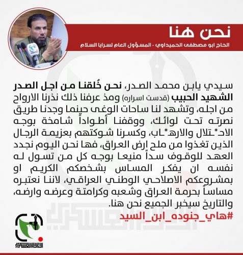 سرايا السلام للصدر: سنقف سداً منيعاً بوجه من يريد المساس بك او بمشروعك الاصلاحي