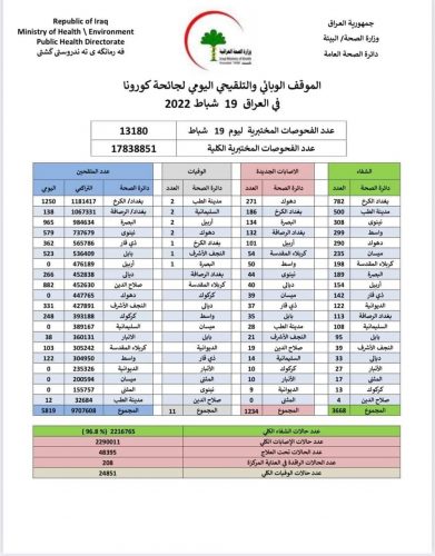 الصحة تسجل 1234 اصابة جديدة بفيروس كورونا