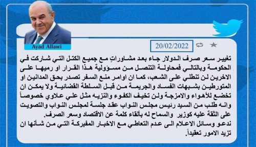 بتغريدة : تعليق غاضب من اياد علاوي بشأن استضافة وزير المالية ومنعه من السفر