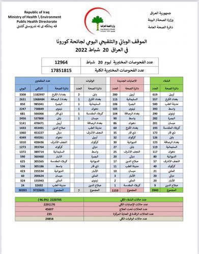 الصحة تسجل 1159 اصابة جديدة بفيروس كورونا