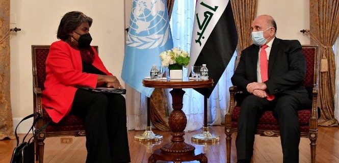 وذكرت وزارة الخارجية في بيان ، أن ” وزير الخارجيَّة فؤاد حسين التقى مع السفيرة ليندا توماس غرينفيلد المندوب الدائم للولايات المتحدة الأمريكيّة لدى الأمم المتحدة في نيويورك، وجرى خلال اللقاء مُناقـَشة أبرز مُستجدّات الأوضاع السياسيّة، والأمنيّة، والجُهُود المبذولة من أجل الإسراع في تشكيل الحكومة المقبلة”.