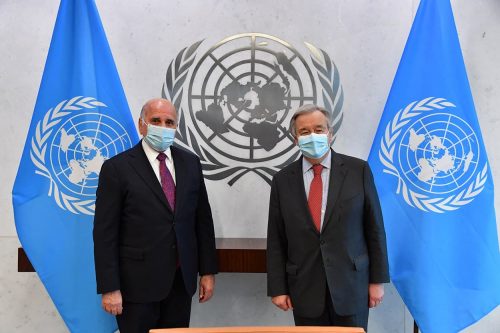 التقى وزير الخارجيَّة فؤاد حسين، الجمعة، مع الأمين العامِّ للأمم المتحدة أنطونيو غوتيريش في مقر الأمم المتحدة في نيويورك، لبحث مُستجدَّات الأوضاع في العراق والمنطقة.