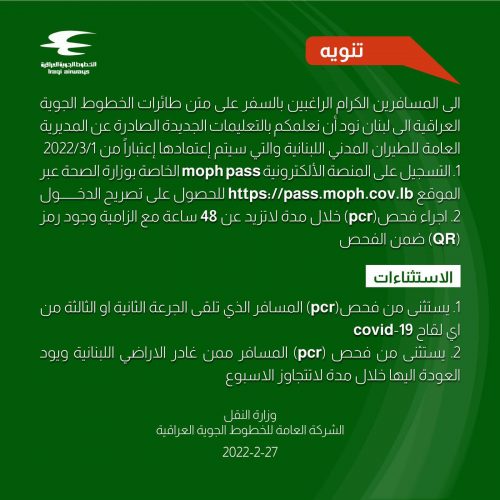 الخطوط الجوية تعلن عن تعليمات جديدة للمسافرين إلى لبنان