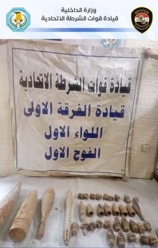 وذكر بيان للقيادة تلقت*الرأ]* الدولية نسخة منه، انه ضمن الجهود الأمنية المستمرة لقطعات الشرطة الاتحادية في تطهير قواطع المسؤولية من مخلفات العصابات الإرهابية ، نفّذت قوة من الفوج الأول اللواء الأول الفرقة الأولى شرطة اتحادية مسنودة بالجهد الاستخباري ومفرزة من متفجرات اللواء ، واجب تفتيش (قرية البطة) في منطقة النهروان شرق بغداد ، أسفرت عن العثور على 10 قنابر هاون ، 21 رأس حربي ، صاروخ spG9 ، 2 صاروخ درع.