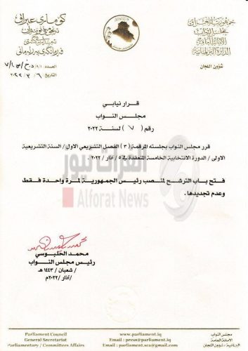 بالوثيقة.. قرار البرلمان بفتح الترشيح لمنصب رئيس الجمهورية