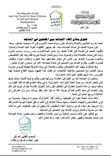 بالوثيقة.. المَجمع الفقهي العراقي يوقف التباعد الاجتماعي في صلاة الجماعة