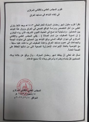 الوقف السني: صدور فتوى بعودة صلاة الجماعة دون تباعد( بالوثيقة )