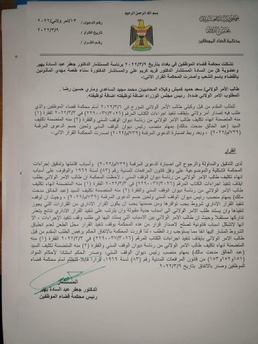 بالوثيقة.. القضاء يرد طلب كمبش لإصدار أمر ولائي بشأن انهاء تكليفه برئاسة الوقف السني