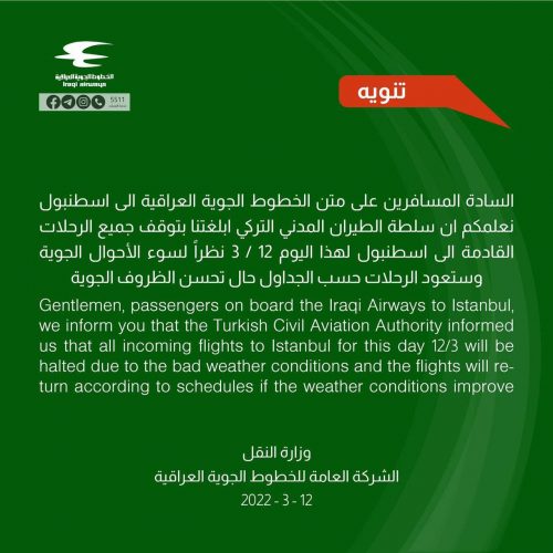 الخطوط الجوية : توقف الرحلات الجوية إلى اسطنبول لهذا اليوم