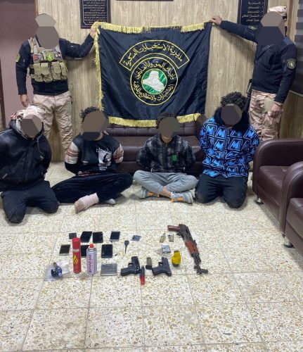 وتابع البيان، “بعدها تم جمع المعلومات والتحري والتدقيق ومن ثم مداهمة عناوين افراد العصابة واعتقال ٤ اشخاص منهم ضبط بحوزتهم عدد من الاسلحة غير المرخصة وميزان الكتروني واجهزة مهشمة لتعاطي المواد المخدرة،والبحث جاري عن المتهمين الاثنين الاخرين”.